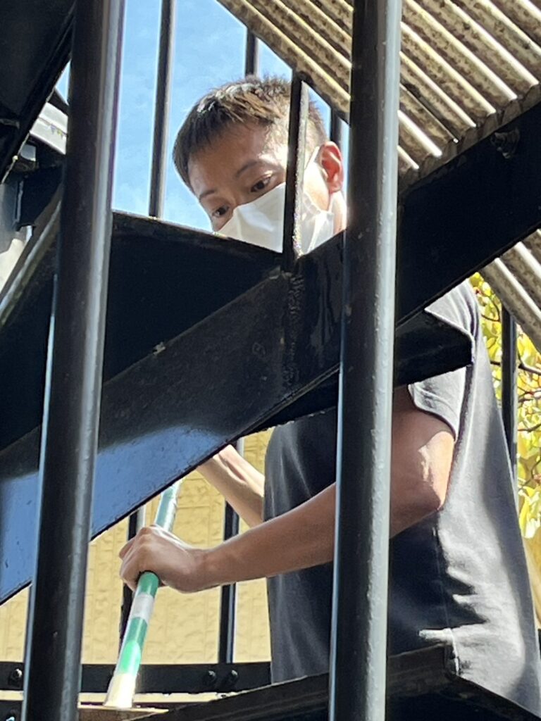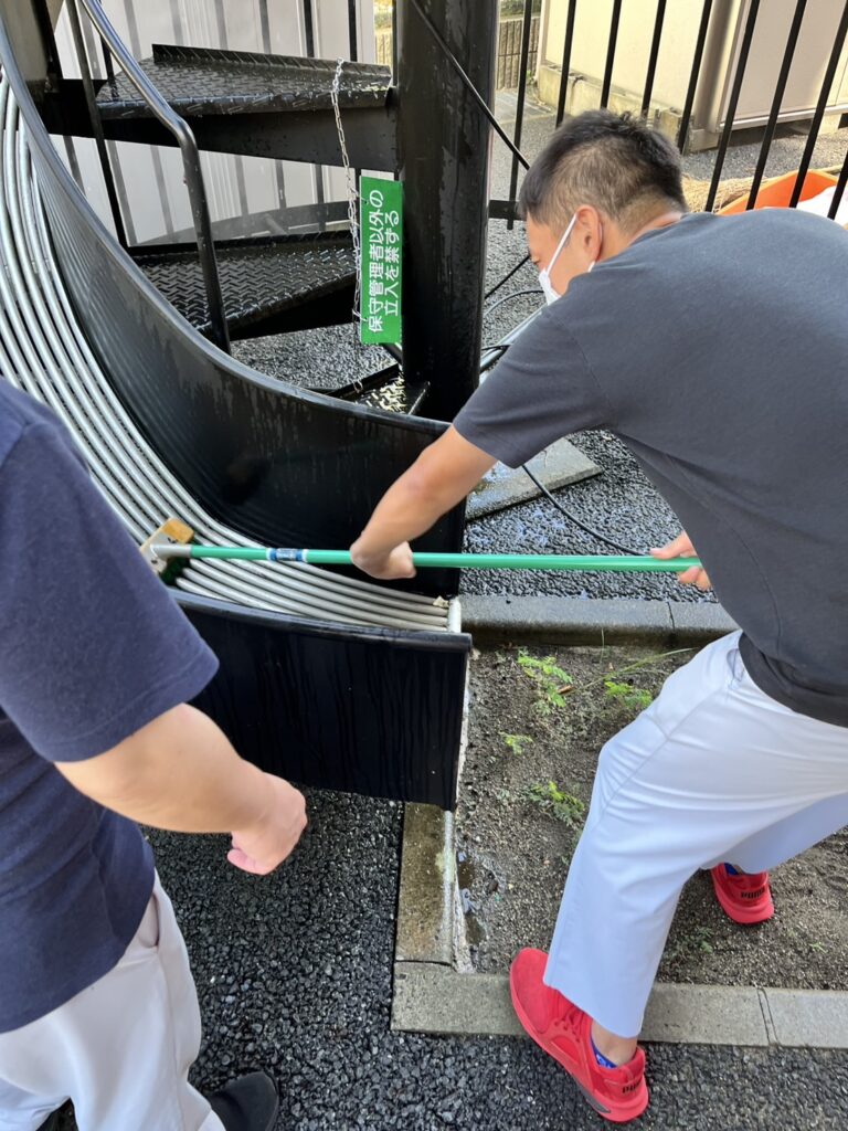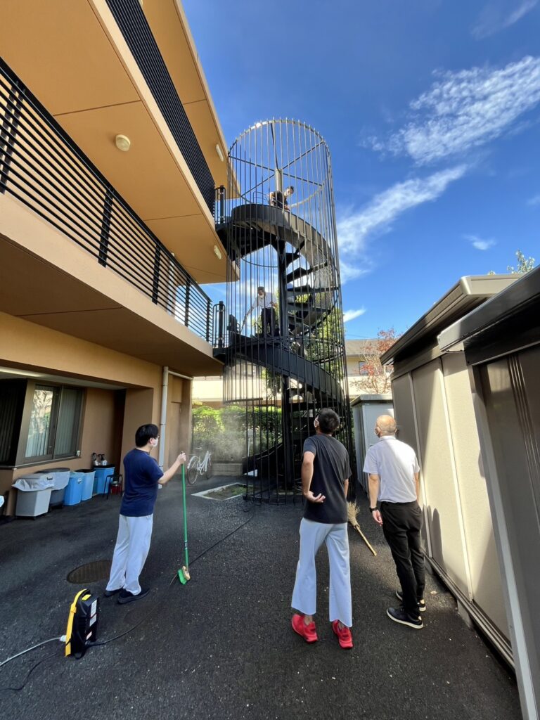 高圧洗浄機で滑り台の汚れを落としてブラシでこまめに掃除していきます🧹🧹🧹