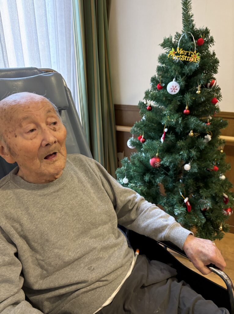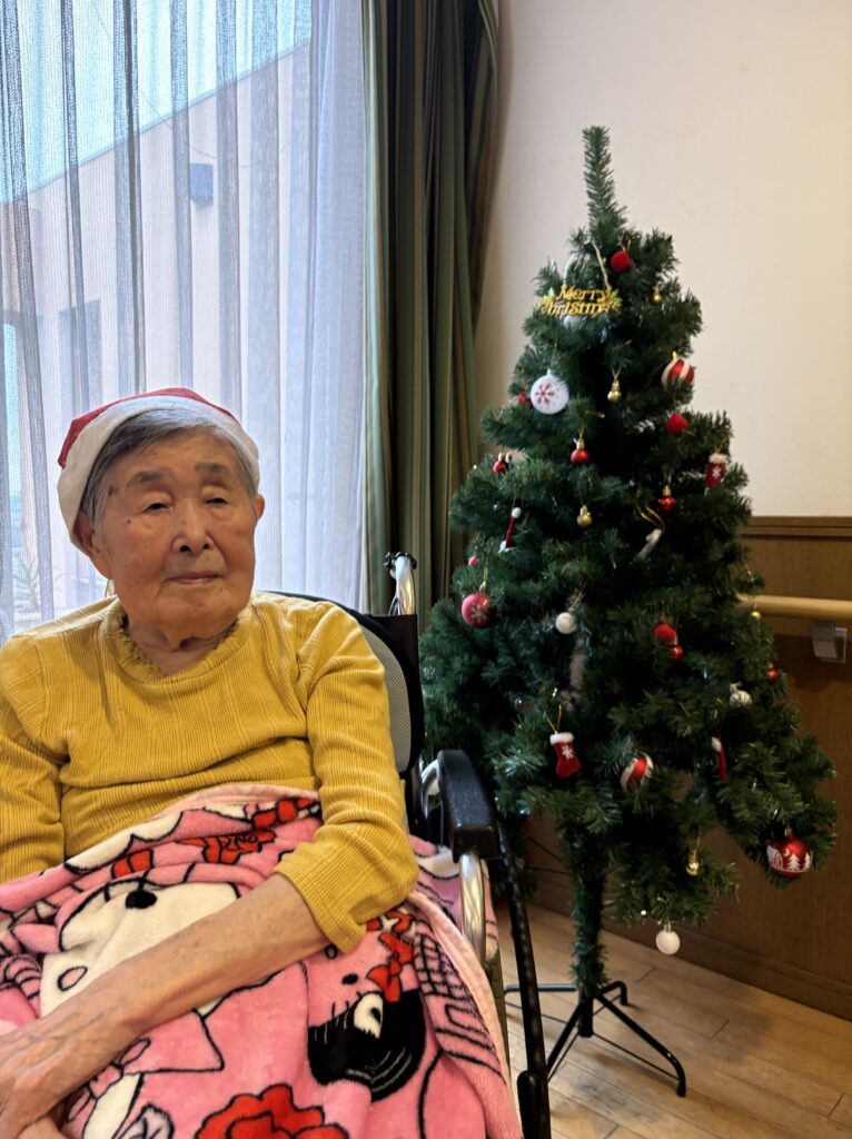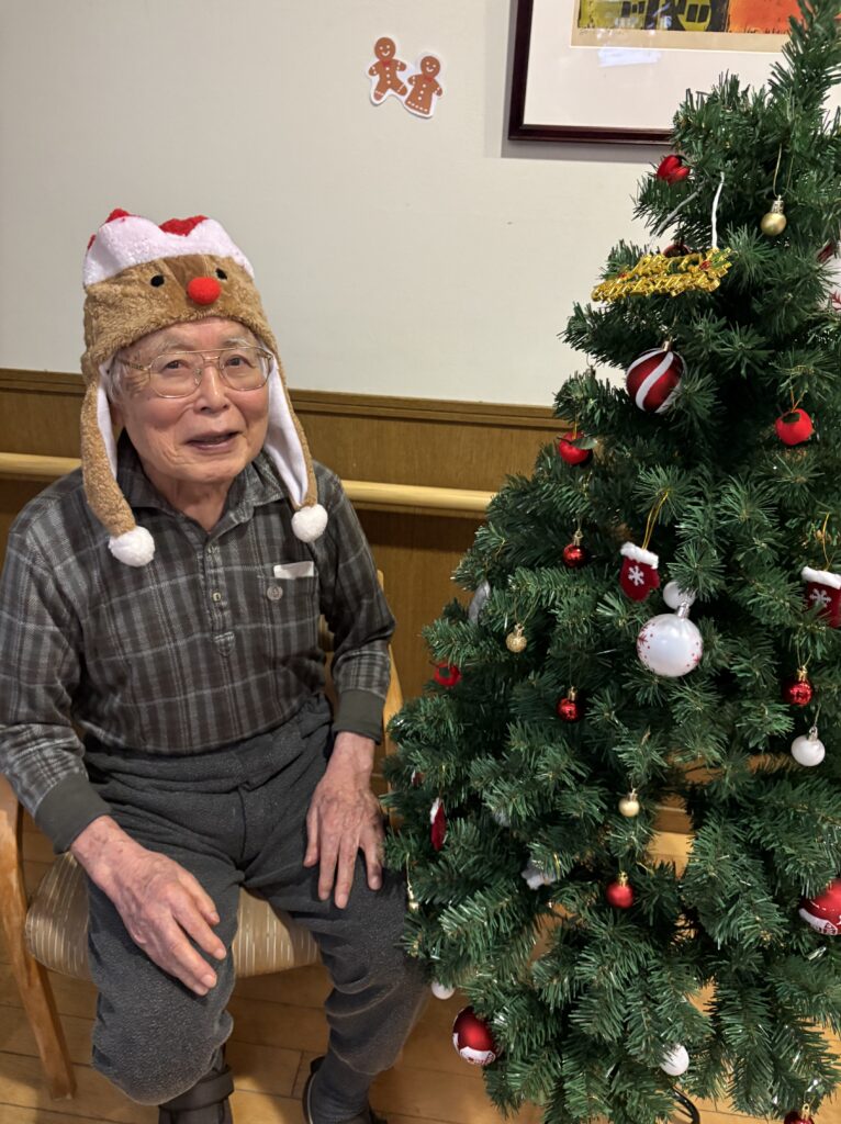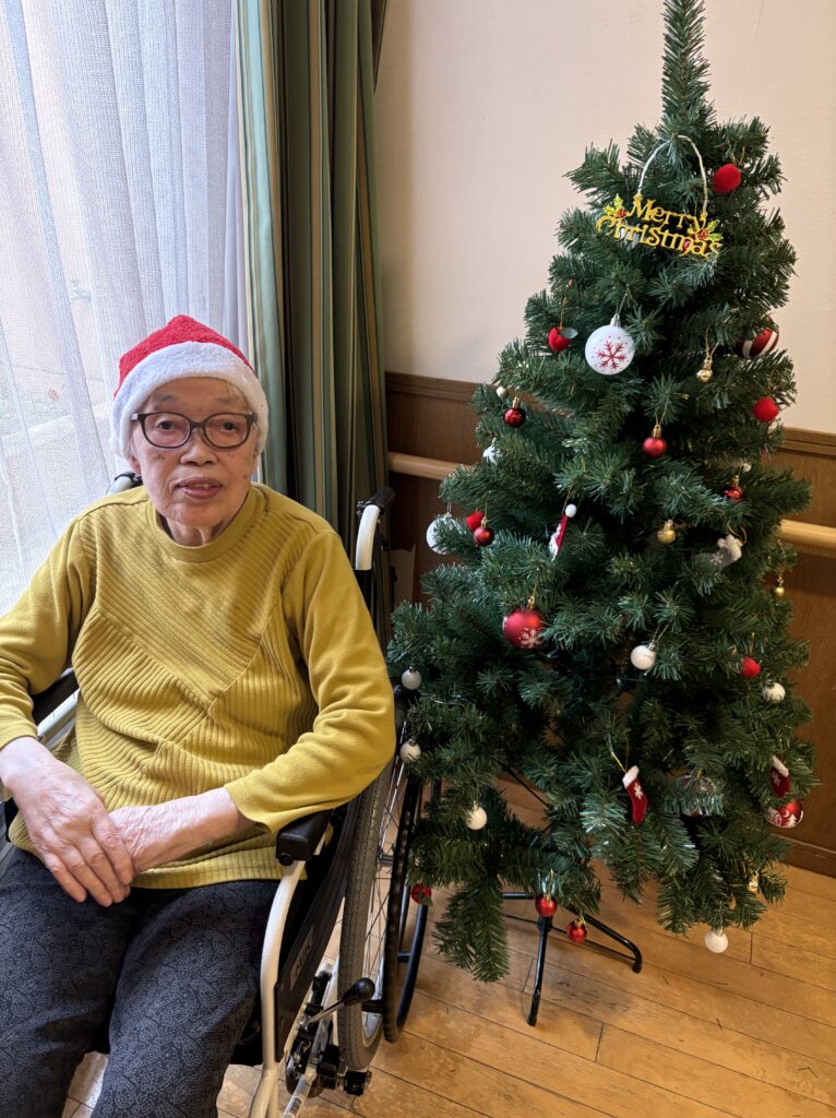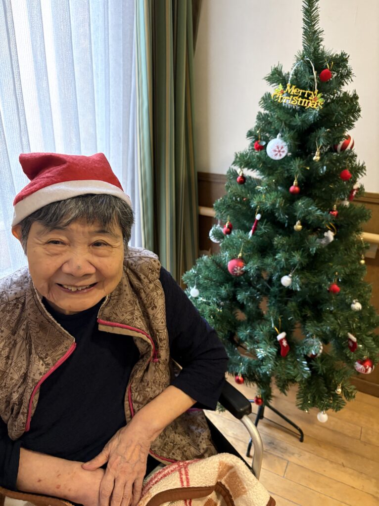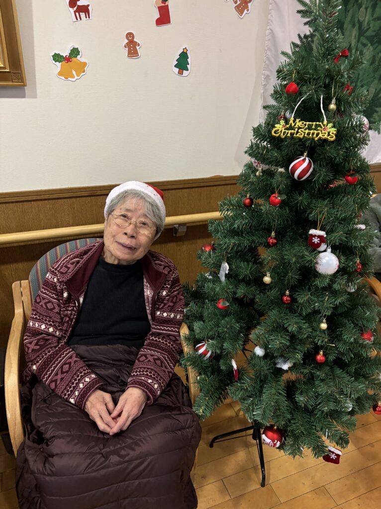 食堂に集まり、クリスマスの歌(あわてんぼうのサンタクロース、ジングルベル)をみんなで一緒に歌い、ツリーと一緒に写真を撮っておやつを食べました。