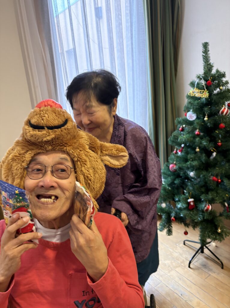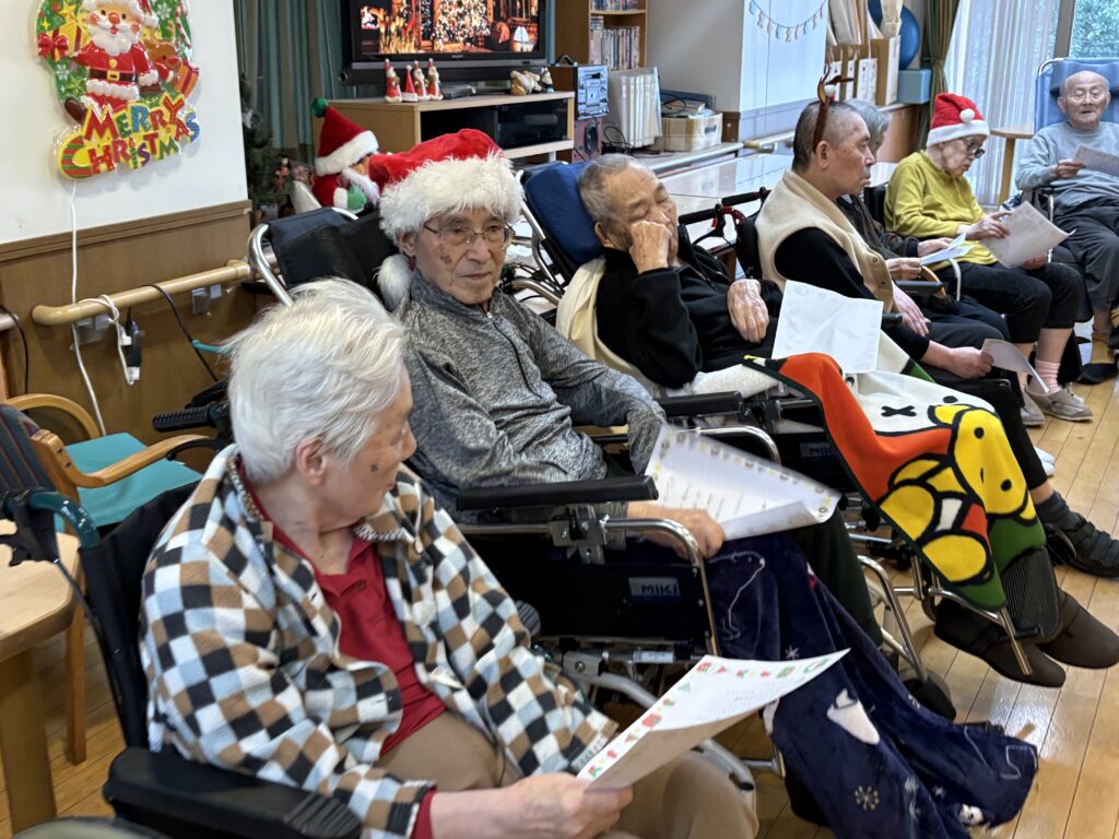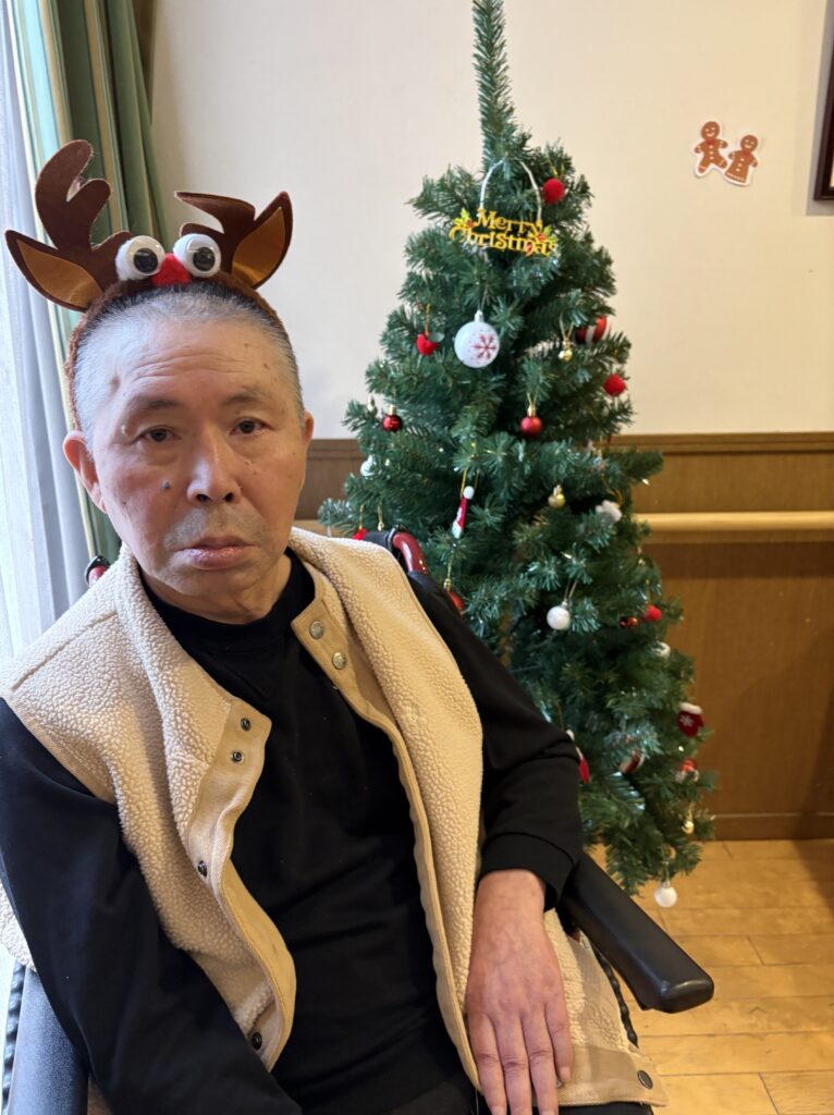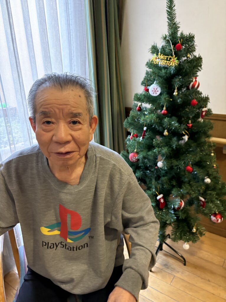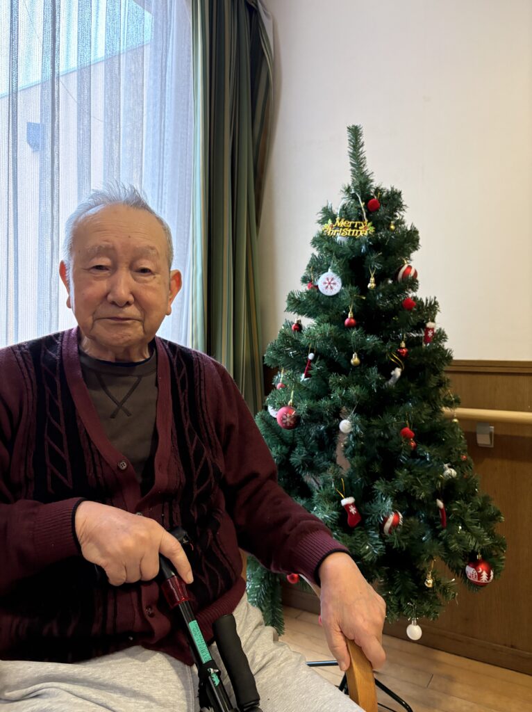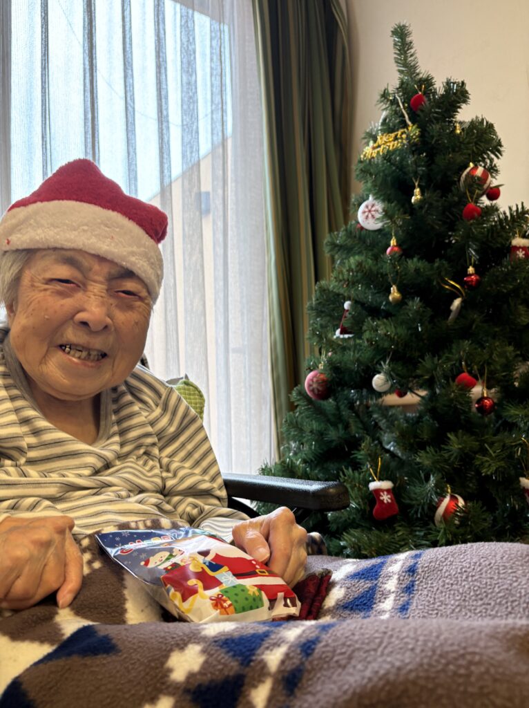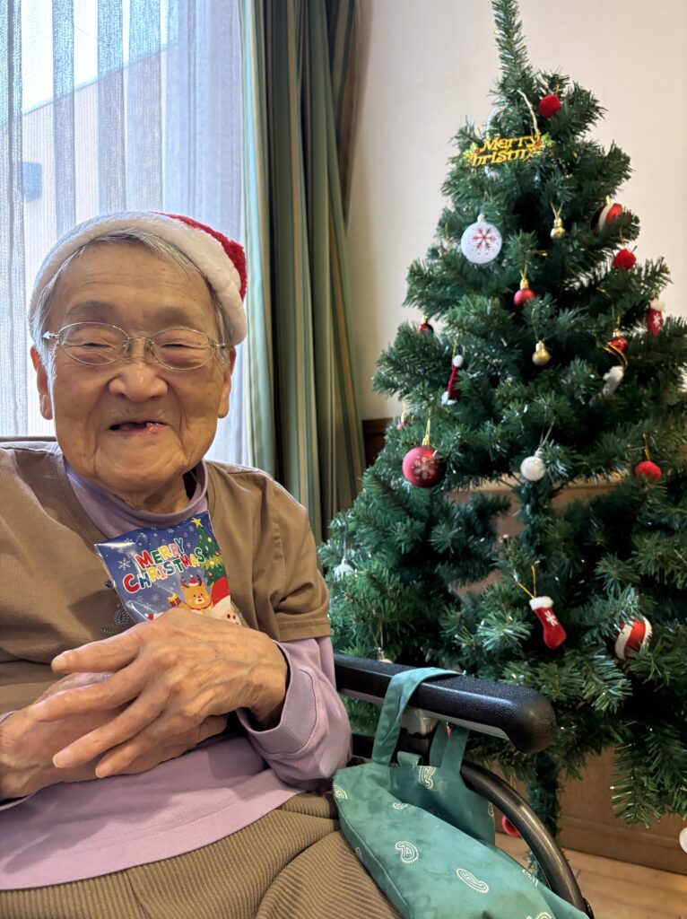 食堂に集まり、クリスマスの歌(あわてんぼうのサンタクロース、ジングルベル)をみんなで一緒に歌い、ツリーと一緒に写真を撮っておやつを食べました。