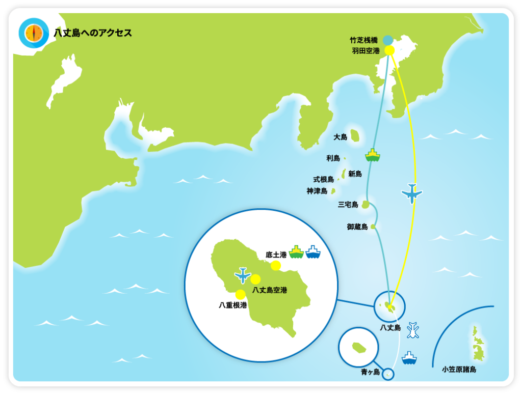 八丈島は伊豆大島からさらに南へ200kmということで、地図で見るとこんなに遠いんだという印象でした。