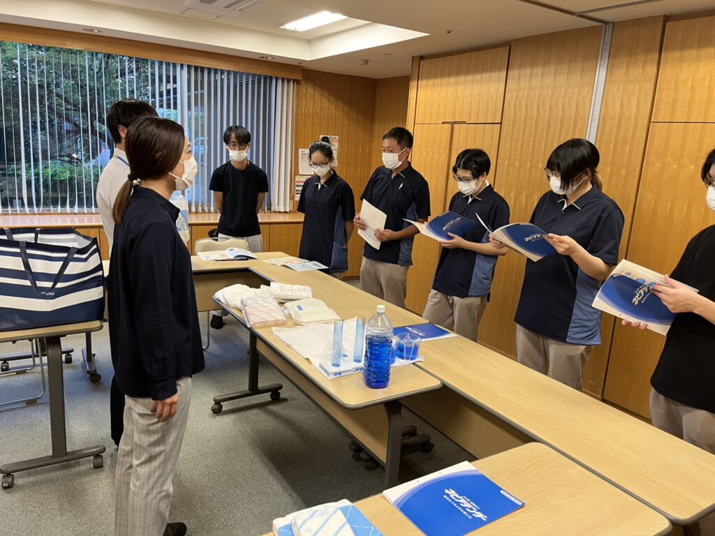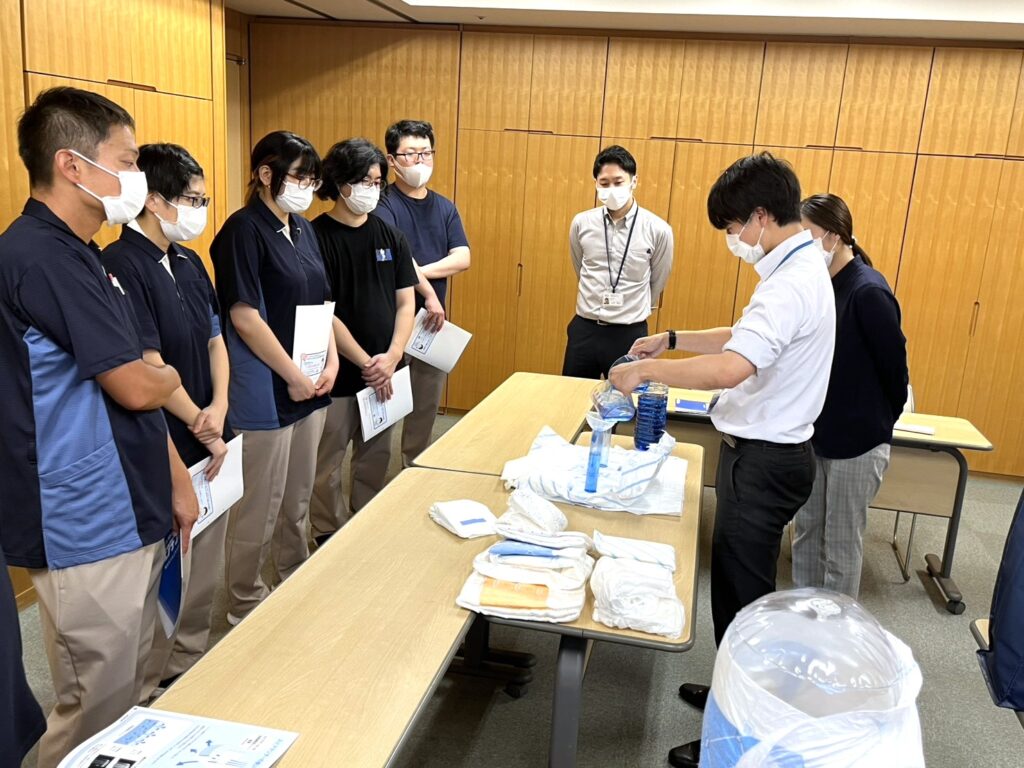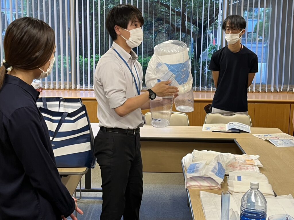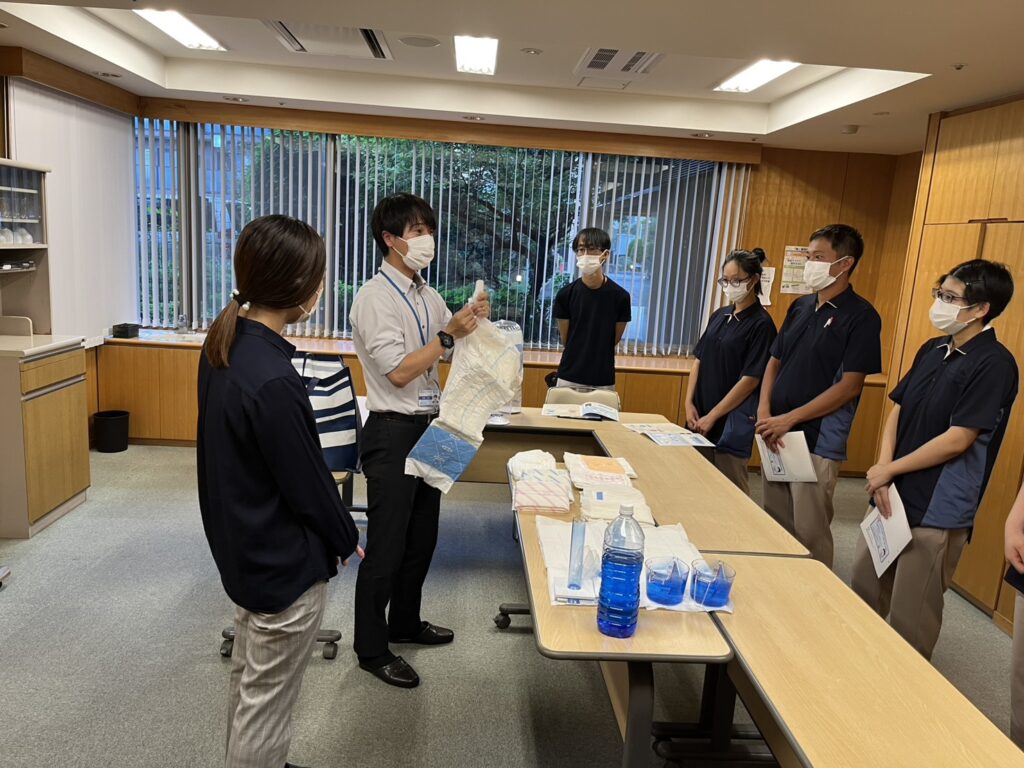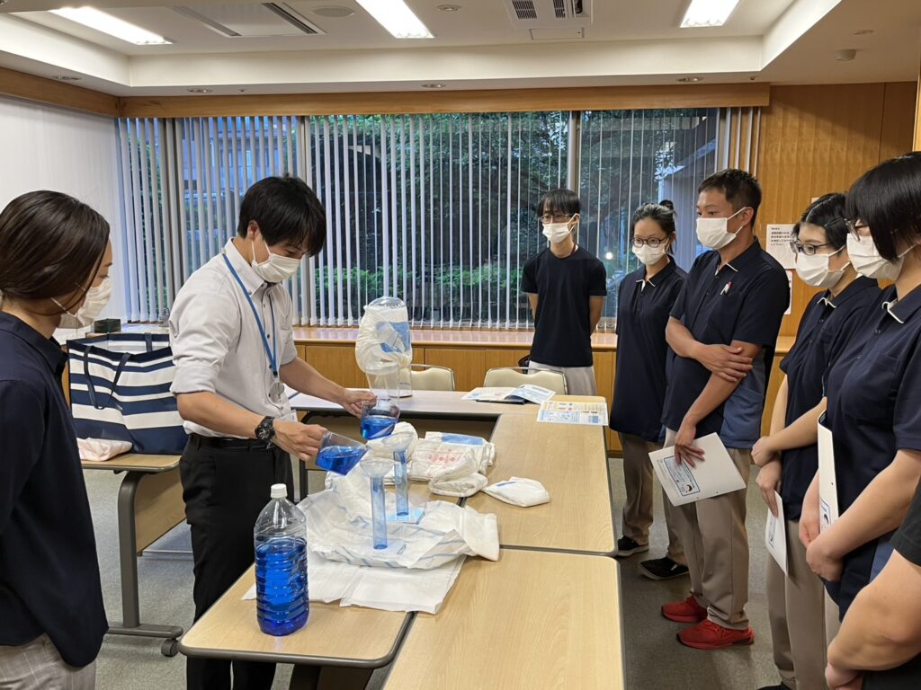 実際に色のついた水をオムツやパットに流して吸収力や重さ、肌触りなど実物を手に観察することができました。