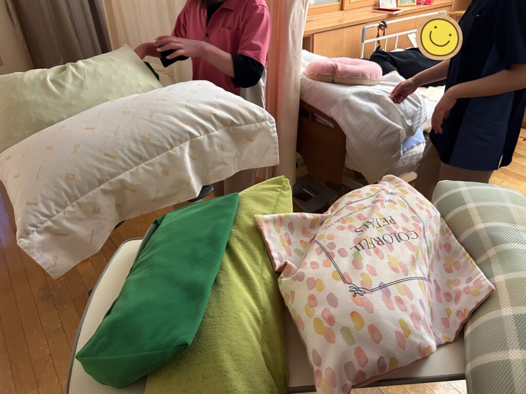 入居者様に協力していただき、どのクッションの当て方が最適か職員に考えてもらいました。最後に現在の対応の仕方と照らし合わせていきます。