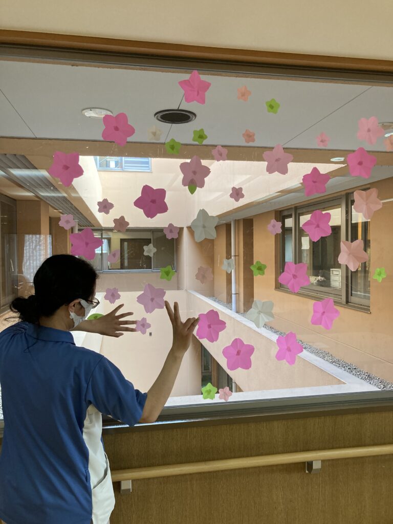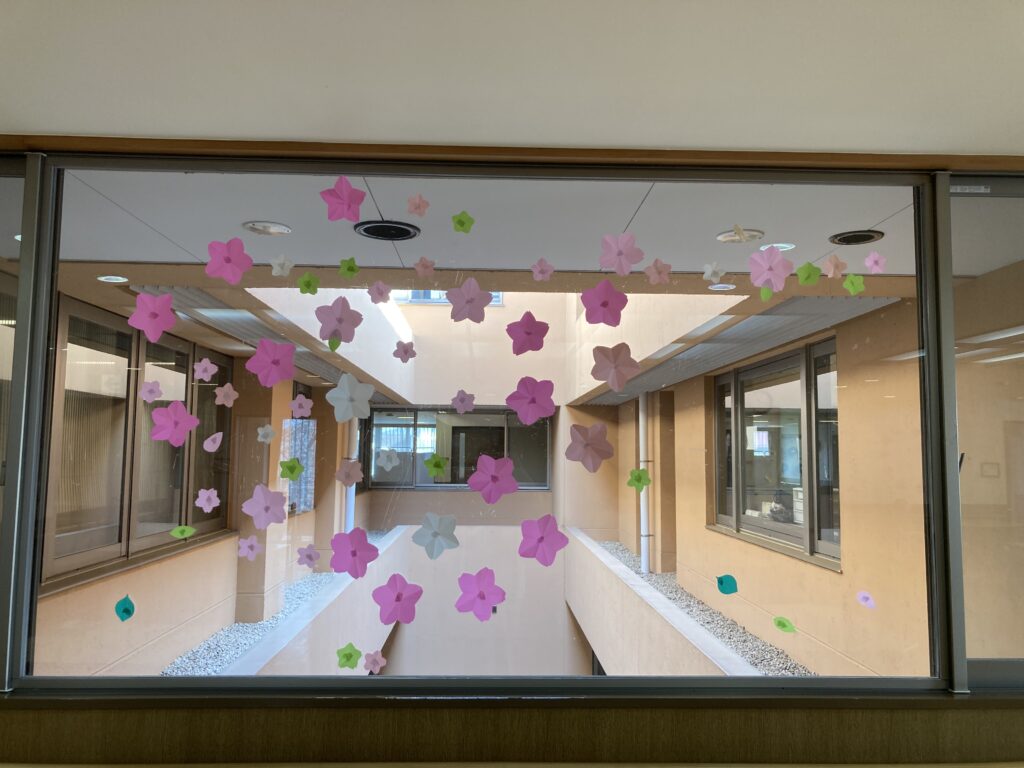 折り紙で作った桜の花びらを好きな場所に貼ってもらいました🌸