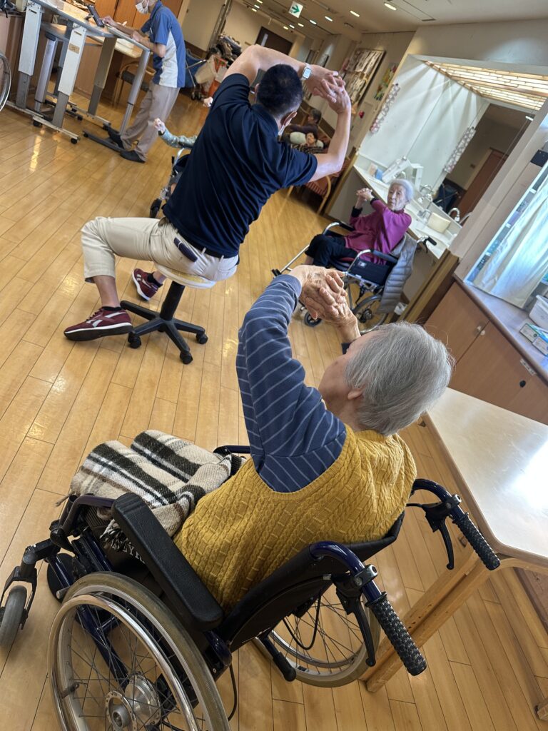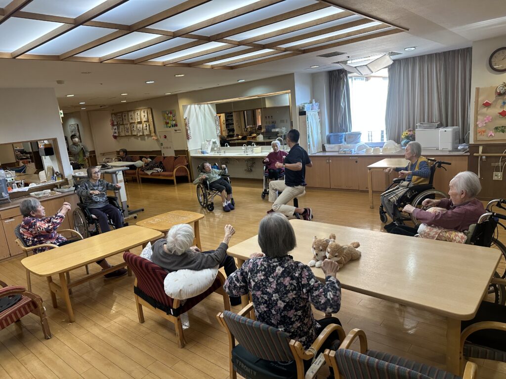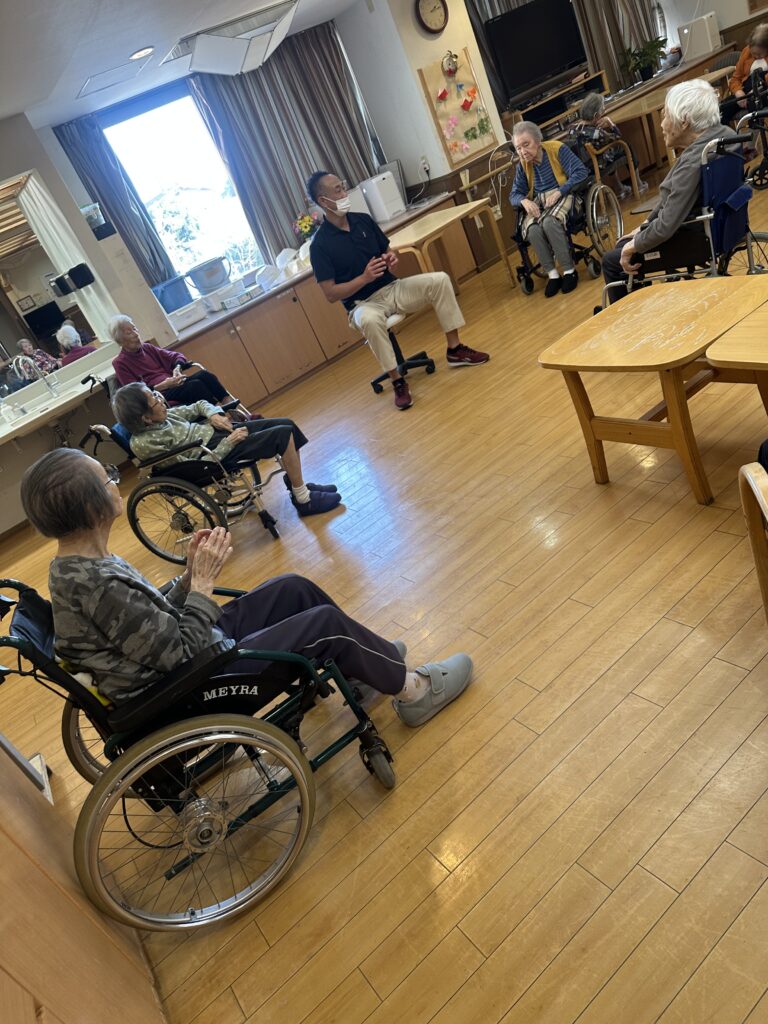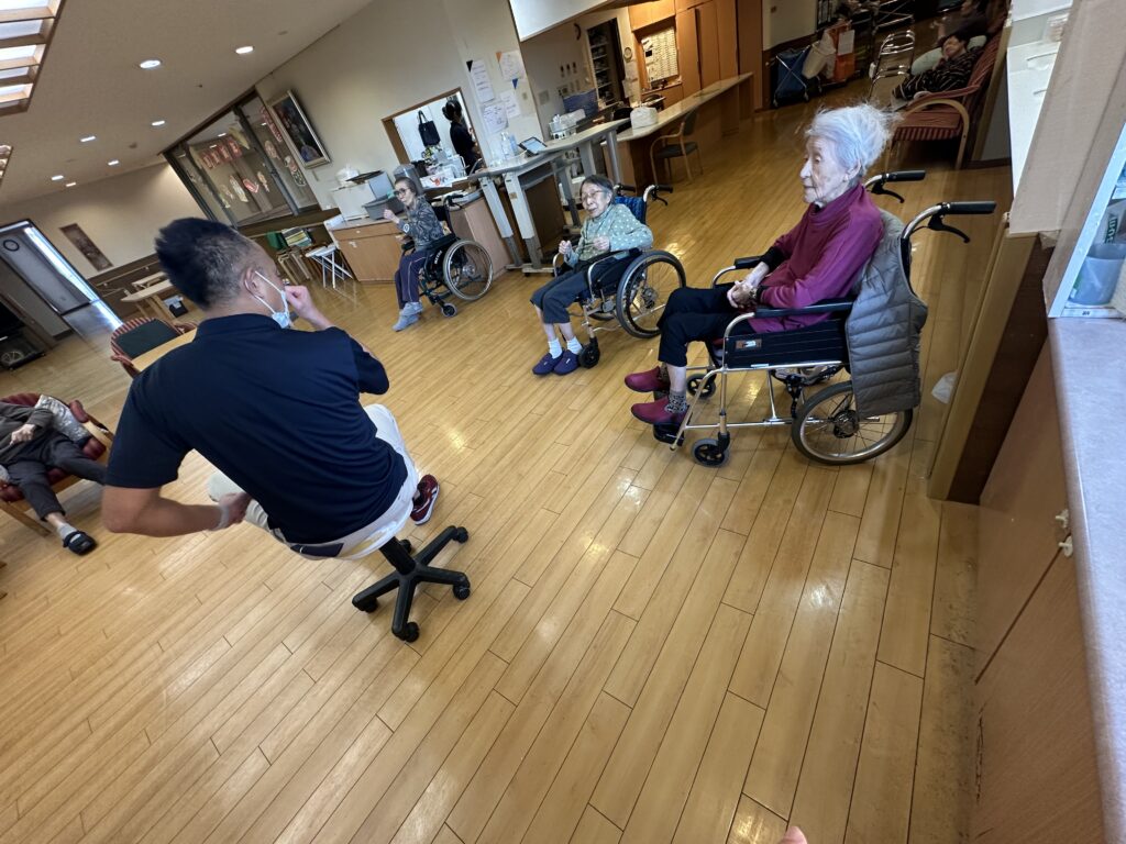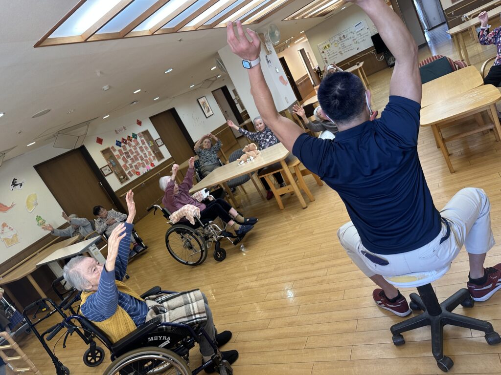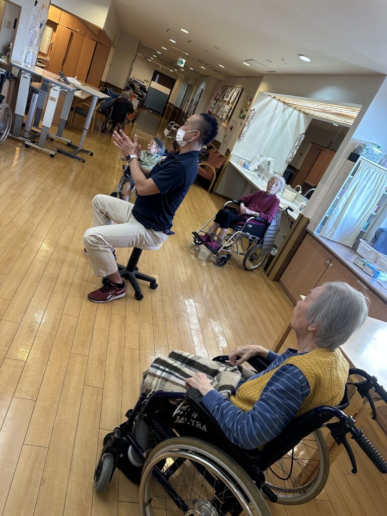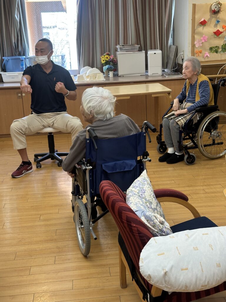 喜多見ホームでは、座位(座った)のまま安全に行えるエクササイズを週に2回、各フロアで実施しております。